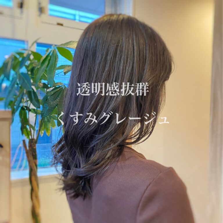 明るさをただ落として落ち着かせるより、透明感のあるグレージュで染めることで、